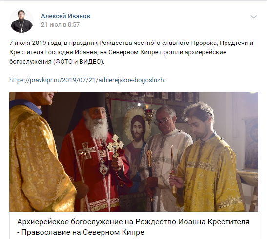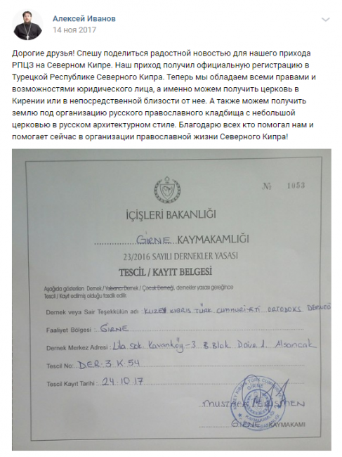Ivanov’s social media post announcing the “good news” that their parish has been officially registered in the Turkish Republic of North Cyprus, and that now they have all the rights and opportunities of a legal entity
