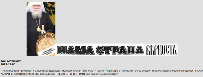 In fact, many of those who schismed from ROCOR were Nazis. There was even an argument on this theme between two representatives of ROCOR schisms (notably, the periodical “Vernost” [“Faithfulness”], whose editor has been accused of plagiarism, was at one time under the strong influence of Pashkovsky, which evoked indignation from representatives of other ROCOR schisms), over precisely who made the speech in praise of Hitler during the period of WWII. But hatred for Russia is after all an anomaly in their ranks, and this factor repelled many representatives of ROCOR from Agafangel and his followers. This is what they say about it:
