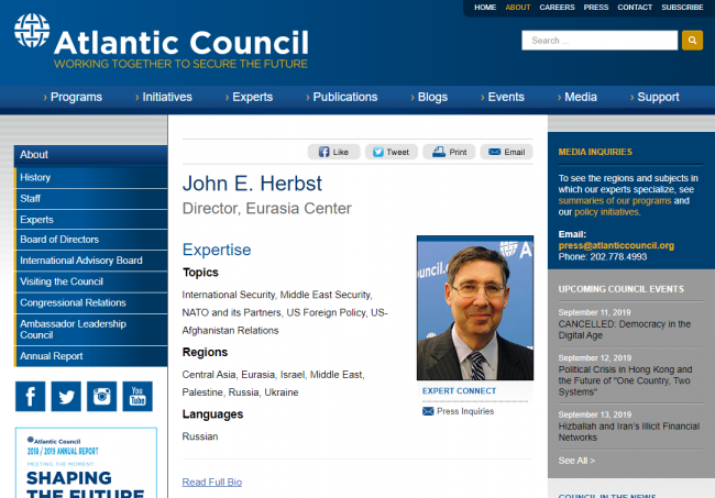 And now let’s return again to Mr. John Herbst. His influence on the military-political situation in the Mediterranean region cannot but be noticed from precisely the point of view of russophobia and opposition to Russia. We know for example that not long ago, the U.S. proposed withdrawing the embargo against Cyprus for the sale of armaments, but under the condition that Cyprus refuse to serve Russian ships. Cyprus did not accept the proposal. But interestingly, Herbst already a year ago promoted the idea of closing European ports to Russian ships from the Sea of Azov. Before that, he proposed many times that the U.S. supply lethal weapons to Ukraine. He can easily push these agendas, being in his current position. The fact is that in July 2010 he was appointed director of the National Defense University Center for Complex Operations, and is also the director of the Eurasian Center of the Atlantic Council—an organization that forms Washington’s political course in many ways. On the website of the Atlantic Council we read about the spheres in which Herbst works: “International security, security in the Middle East, NATO and its partners, U.S. foreign policy, American-Afgani relations,” as well as the appointed territories over which Herbst’s activities spread within the framework of this organization’s activity: Central Asia, Eurasia, Israel, the Middle East, Palestine, Russia, and Ukraine. Among other things, on the website of the Atlantic Council we find text from March 31, 2019 about how work is on to bring Cyprus closer to NATO.