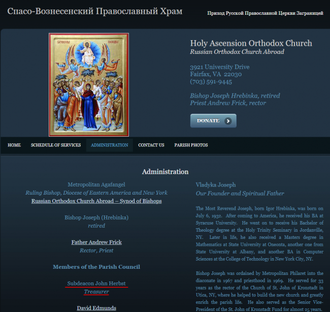 On the official site of the schism Herbst is listed in the Synod as assistant to Metropolitan Agafangel. He is also listed in the Washington parish as Treasurer, which gives him the ability to influence the structure’s cash flow. Besides this, on the schismatics’ forum, text can be found of a letter by the former chairman of the Fund for Assistance of ROCOR Dimtry Goncharov, who recalls that John Herbst’s wife Nadezhda Herbst was the secretary of this fund (could that be where the money came from that Alexei Ivanov so generously spread around when he came to Northern Cyprus)?