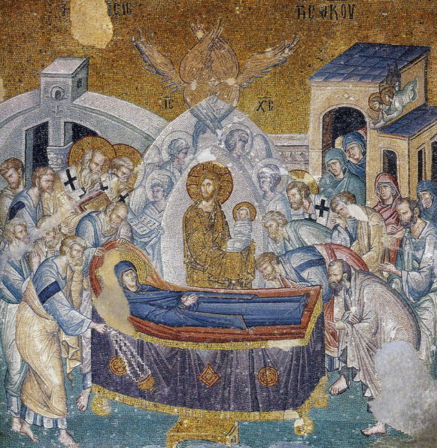 Today the Mother of our God has been taken from us, the Intercessor for our salvation, the protecting veil of our souls, the inextinguishable candle, the ever-living Virgin, the unpurloinable treasure, the bush not consumed by fire, the fleece filled with the Holy Spirit.