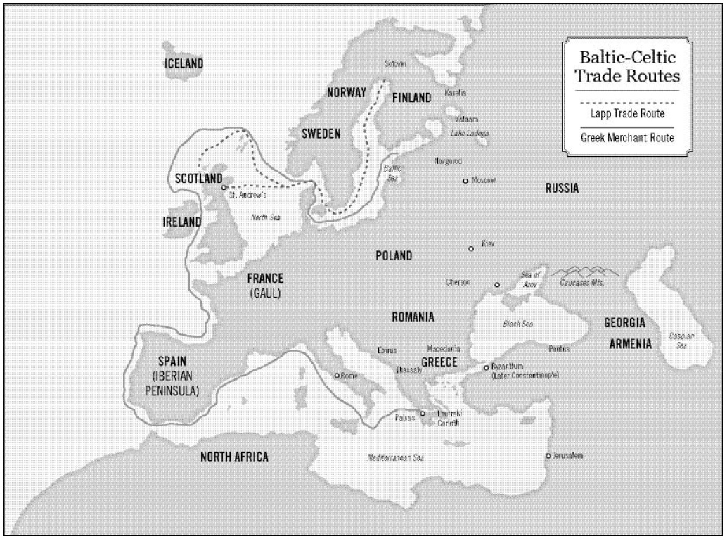 Except for this remote chance, I didn’t see how he could have gotten to Scotland until I found something else that made it very possible. According to ancient Greek writers there was an inland route for Greek merchants from the Baltic Sea. From the Greek Crimea they traveled up the Russian rivers, the Dnepr, Dvina etc. to what is now St. Petersburg (as St. Andrew himself did according to Russian tradition). Then to avoid the hard Russian winter, they didn’t return to Greece the same way but sailed the Baltic, where they bought amber, and then to Scotland where they made their way down the coast to Cornwall trading for tin. From Cornwall, they traveled down the Iberian Peninsula to Gibraltar, then past