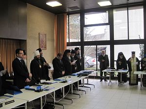The session is chaired by Metropolitan John of Pergamon, Patriarchate of Constantinople. The delegation of the Russian Orthodox Church. Led by Metropolitan Hilarion of Volokolamsk, chairman of the Moscow Patriarchate’s Department for External Church Relations (DECR), includes Archbishop Mark of Berlin, Germany and Great Britain, Russian Orthodox Church Outside of Russia; archpriest Nikolai Balashov, DECR deputy chairman; and the interpreter Anatoly Churiakov.