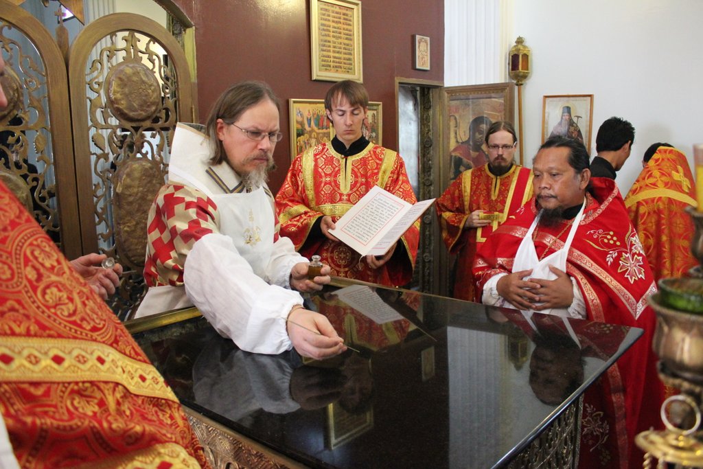 His Eminence Mark presented Rev. Danai (Daniel) Vann with a patriarchal award, a golden pectoral cross. The right to wear it was granted to the first Thai Orthodox priest for his zealous work for the good of the Church and the Thai translation of Archpriest Seraphim Slobodskoy’s Bible chairs.