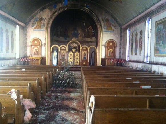 The inside of the church remains heavily damaged, mostly to the right rear of the building.