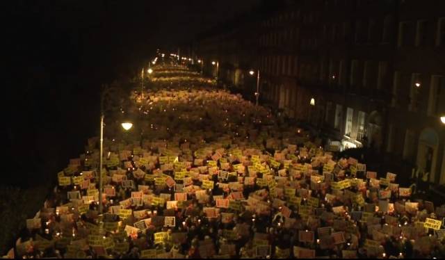 Tens of thousands thronged the streets of Dublin outside the country’s parliament on Friday night to demand that the Fine Gael/Labour coalition government keep a campaign promise to keep Ireland abortion-free. Demonstrators came from around the country for the vigil and rally, the highlight of which was a phone call to the Prime Minister’s office in which 30,000 people chorused, “Enda, Keep Your Promise.”