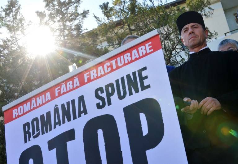 Vasile Laiu, the Christian Orthodox archpriest of Barlad, takes part in a protest against shale gas exploition next to a pancarte reading in Romanian "Romania without fracking, Romania say STOP". Picture: AFP For months the 50-year-old cleric has been one of the most outspoken opponents to plans by US energy giant Chevron to drill for shale gas in this rural and impoverished region.