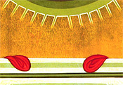 The icon of the Feast of Pentecost is known as "The Descent of the Holy Spirit". It is an icon of bold colors of red and gold signifying that this is a great event. The movement of the icon is from the top to the bottom. At the top of the icon is a semicircle with rays coming from it (1). The rays are pointing toward the Apostles, and the tongues of fire are seen descending upon each one of them signifying the descent of the Holy Spirit (2).