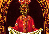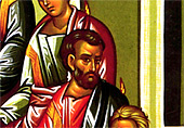 In the center of the icon below the Apostles, a royal figure is seen against a dark background. This is a symbolic figure, Cosmos, representing the people of the world living in darkness and sin, and involved in pagan worship (7). However, the figure carries in his hands a cloth containing scrolls which represent the teaching of the Apostles (8). The tradition of the Church holds that the Apostles carried the message of the Gospel to all parts of the world.