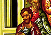 The building in the background of the icon represents the upper room where the Disciples of Christ gathered after the Ascension. The Apostles are shown seated in a semicircle which shows the unity of the Church (3). Included in the group of the Apostles is Saint Paul (4), who, though not present with the others on the day of Pentecost, became an Apostle of the Church and the greatest missionary. Also included are the four Evangelists—Matthew, Mark (5), Luke (6), and John—holding books of the Gospel, while the other Apostles are holding scrolls that represent the teaching authority given to them by Christ.