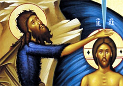 The Icon of the Feast of Theophany tells the story from the Gospels in images and color. On the left side of the icon we see John the Baptist (1) who is dressed in camel’s hair and has the appearance of one who lives in the wilderness. His arms are outstretched, showing an attitude of prayer and reverence, but also directing others to Christ. With his right hand he is conducting the baptism.