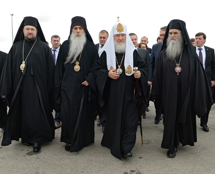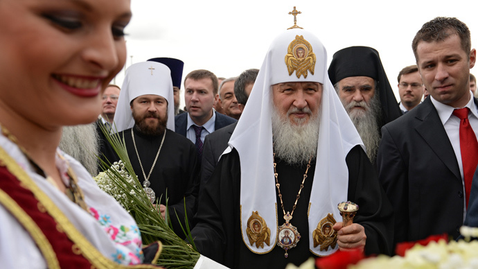 Patriarch Kirill of Moscow and All Russia, center, during a welcoming ceremony at Belgrade's Nikola Tesla Airport. (RIA Novosti / Sergey Pyatakov) Patriarch Kirill of Moscow and All Russia, center, during a welcoming ceremony at Belgrade's Nikola Tesla Airport. (RIA Novosti / Sergey Pyatakov)