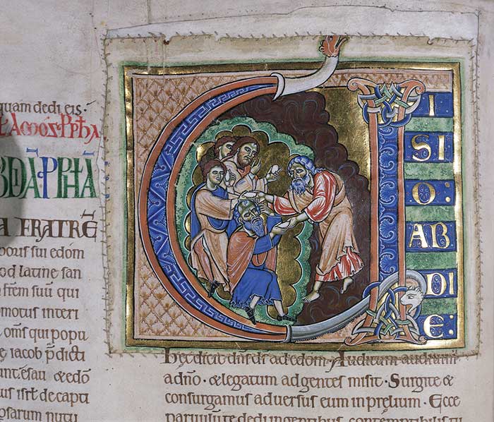 A ninth initial, for the Vision of Obadiah, was stolen but later recovered. It was identified at Sledmere House, East Yorkshire, in 1948. The cathedral bought it back for £400 and stitched it into the text (as shown above). A market source says that single initials from the Winchester Bible could now be worth up to £1m on the open market.