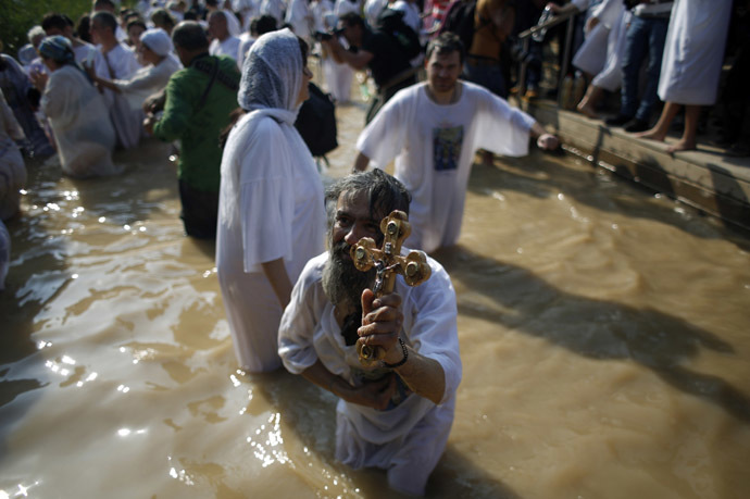 A Christian pilgrim holds a cross as he dips in the water after a ceremony at the baptismal site known as Qasr el-Yahud on the banks of the Jordan River near the West Bank city of Jericho January 18, 2015. (Reuters/Mohamad Torokman) For those coming to visit the Holy Land there are few opportunities to see how hard the Palestinians’ situation is. What would you like to say to those wishing to understand better the Palestinian problem?