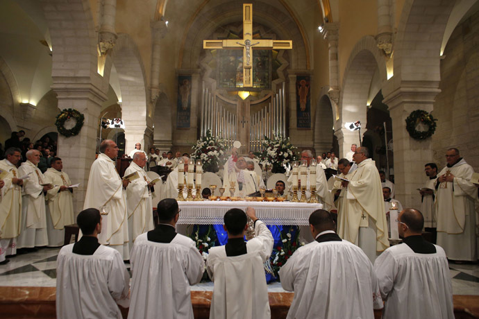 Christian priests hold a Christmas Midnight Mass at the Church of the Nativity in the West Bank town of Bethlehem December 25, 2014. (Reuters/Ammar Awad) Do people say Allahu Akbar in church?