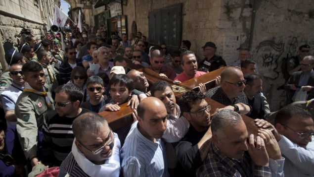 Christian worshippers carry a cross towards the Church of the Holy Sepulcher, traditionally believed by many to be the site of the crucifixion of Jesus Christ, during the Good Friday procession in Jerusalem’s Old City, Friday, March 29, 2013. (AP Photo/Sebastian Scheiner) Improving tourism across the region could duplicate these results for Jordan and Palestine, EcoPeace believes. It’s also a short-term, tangible plan that can help Israelis, Jordanians and Palestinians get started on the long journey of cleaning the Jordan River.