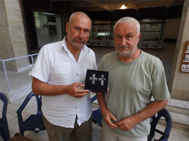 Archaeologists Nikolay Ovcharov (left) and Angel Konakliev (right) with the 14th century lead cross reliquary found in the medieval city of Missionis / Krum’s Fortress near Bulgaria’s Targovishte. Photo: 24 Chasa daily Archaeologists Nikolay Ovcharov (left) and Angel Konakliev (right) with the 14th century lead cross reliquary found in the medieval city of Missionis / Krum’s Fortress near Bulgaria’s Targovishte. Photo: 24 Chasa daily