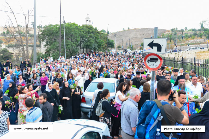 Upon the tolling of the bells of the Church of the Resurrection, the procession began with the icon carried by the Hegoumen at Gethsemane, Archimandrite Nektarios. He was surrounded by Hagiotaphite Fathers, Primates and Hieromonks, and Archimandrite Bartholomew, Assistant Dragoman and Master of Ceremonies. A long row of monks, nuns and faithful walked ahead, as a crowd of Christians, Orthodox and others, both locals and pilgrims, elderly, young and children, stood on both sides of the street in order to venerate the icon. Amidst troparia to the Theotokos, the procession crossed the Via Dolorosa to Gethsemane, where it paused for a supplication at the St Alexander Nevsky Church of the Russian Church, near St Charalambos Monastery, before the Monastery of the Praetorium, the Monastery of Sts Joachim and Anne and the Monastery of St Stephen, before arriving at the Church of the Dormition of Theotokos in Gethsemane.