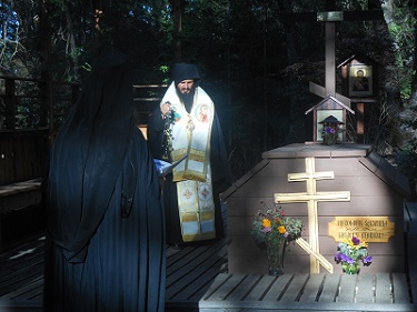Following Vespers the gathered faithful processed up the hill to Fr. Seraphim’s grave at the Entrance of the Theotokos “Skete,” where a Pannikhida was served in his honor in three languages, demonstrating that Fr. Seraphim is indeed, in the words of Hieroschemamonk Ambrose, a “universal saint.” Fr. Damascene and the monastery’s Fr. Paisy served in English, along with Met. Saba serving in Georgian, and Archimandrite Ilarion of the Monastery of the Holy Archangels Gabriel and Michael in Draganac, in Kosovo, Serbia who arrived during the Pannikhida, serving in Serbian.