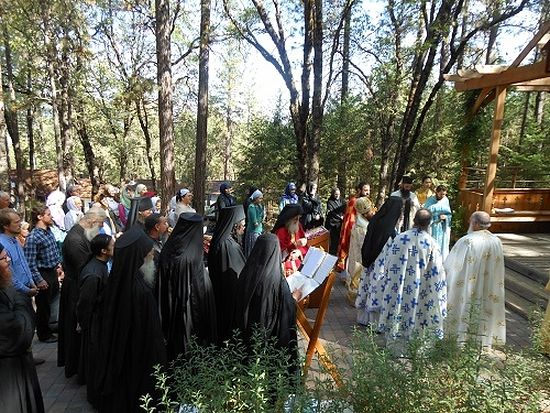 Following the Pannikhida and the evening meal Small Compline and Matins were served in the monastery church. In the morning the services began in the church with Midnight Office and the Hours, after which those gathered again processed to the grave of Fr. Seraphim to celebrate the Divine Liturgy, which was served quietly and beautifully. As main celebrant, Met. Saba, along with Abbot Damascene, was again joined by Frs. Evtimi, Arsenie, Ilarion, and Paisy, as well as Fr. Nektarios Rozadilla of St. George Greek Orthodox Church in Redding, CA, and Fr. Ian Shipley and Dcn. David Greenfield of Sts. Cyril and Methodios Church (OCA) in Chico, CA. The celebrants served again in English, Georgian, and Serbian, with the brotherhood choir responding peacefully in English and Slavonic. Altogether about fifty people were in attendance, many receiving Holy Communion.