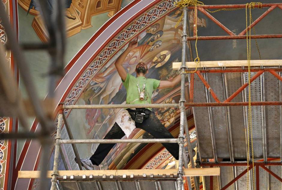 Tall scaffolding line the transepts of the church — the east-west arms of the sanctuary — where the iconographer and his crew stand high above the pews and roll out the canvases he created back in Greece.