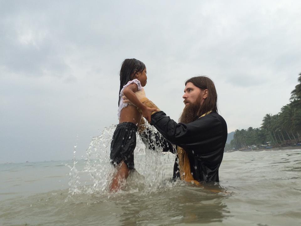 Despite massive waves that repeatedly knocked them over, Frs. Silouan Thompson and Stanislav Rasputin celebrated the baptism of 187 new Orthodox Christians, lasting six hours.