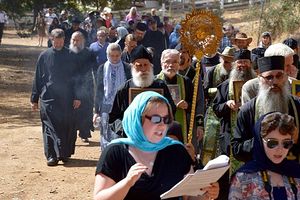 The solemn dedication was also participated in by His Grace Theodosy, Bishop of Seattle; the abbot of the monastery, Archimandrite Irenei; many clergy of the Western American Diocese; other local clergy from various Orthodox jurisdictions; and approximately 180-210 pilgrims. At the end of the Divine Liturgy a sermon about Saint Silouan and the purpose of monasteries for the world was given by Archimandrite Irenei; and the Divine Services were completed as the faithful participated in a Cross Procession through the grounds of the monastery property. With lamp, cross and banners, holy relics of the Saint and the monastery’s newly-commissioned Patronal Icon, the clergy, choir and faithful trekked in orderly formation across the expanses of the monastery, at which time the sites for new cells, the cemetery and a new cross high upon a ridge were blessed.