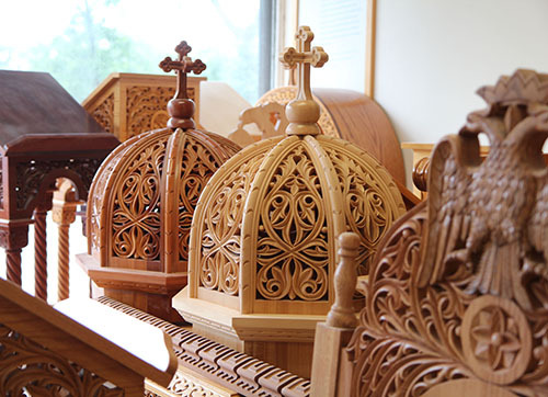 The firm specializes in Greek Orthodox church work. He made his living carving the icon screens, bishop's thrones, pulpits, chanter's pews and candle stands that made him -- and Byzantion -- famous in the field.
