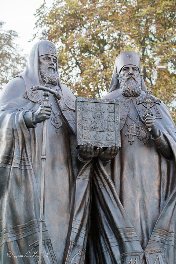 The bronze sculpture depicts Patriarch Alexy II of Moscow and All Russia and Metropolitan Laurus, who signed the Act of Canonical Communion between the Russian Orthodox Church and the Russian Orthodox Church Outside of Russia, which overcame the division caused by the Revolution and subsequent Civil War in Russia.
