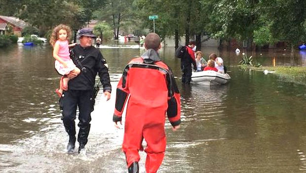 Firefighters rescue a child from floodwaters–a scene that has been repeated hundreds of times since devastating floods swept across South Carolina this weekend. IOCC is in contact with Orthodox Church communities in South Carolina and has called on members of the IOCC Emergency Response Network who live in the affected area to prepare to respond as the needs emerge. Photo: City of North Charleston