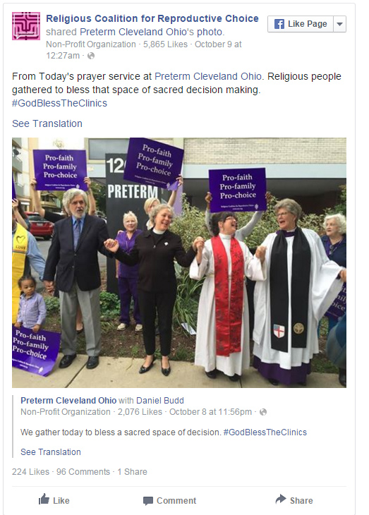 RCRC is based in Washington, D.C. Its national president, Rev. Harry Knox, participated in the Cleveland demonstration as well, and told the Columbus Dispatch, “I’m here today standing alongside my fellow clergymen and clergywomen to say, thank God for abortion providers.”