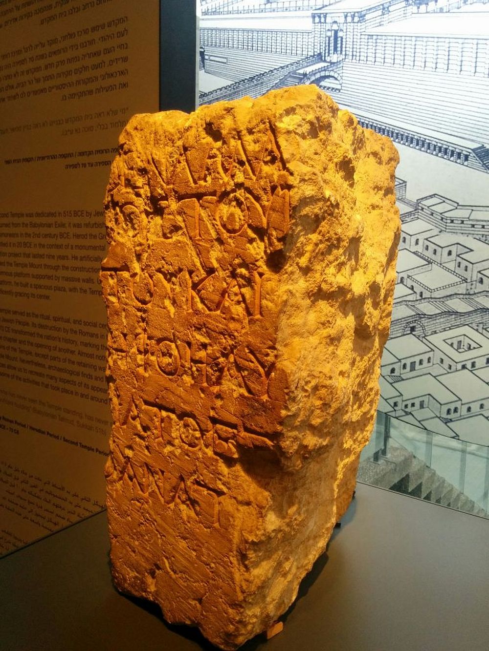 Two millennia ago, the block served as one of several Do Not Enter signs in the Second Temple in Jerusalem, delineating a section of the 37-acre complex which was off-limits for the ritually impure — Jews and non-Jews alike. Written in Greek (no Latin versions have survived), they warned: “No foreigner may enter within the balustrade around the sanctuary and the enclosure. Whoever is caught, on himself shall he put blame for the death which will ensue.”