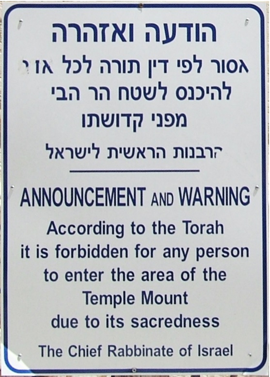 A contemporary warning sign posted at the entrance to the Temple Mount warning Jews against entrance. (CC BY-SA Bantosh via Wikimedia Commons) A contemporary warning sign posted at the entrance to the Temple Mount warning Jews against entrance. (CC BY-SA Bantosh via Wikimedia Commons)