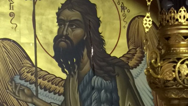 I don’t normally get my news from facebook, but recently a friend posted about a miracle icon in Homer Glen, Illinois and I was thrilled! I called the Assumption Greek Orthodox Church right away and spoke with Fr. Sam (Sotirios) Dimitriou. He said the oil has been on the icon of St. John the Baptist since mid-July, but recently there was more activity. The icon is on the iconostasis, the icon screen that separates the altar from the nave. In front of the icon is a table for memorials and a hanging vigil lamp.