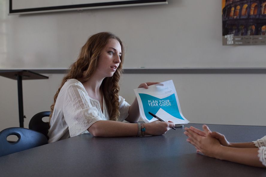 As the video ends, Wilkinson stands to address the group. "Thank you, guys! So good to be here," she says. She is poised and smiling in a peasant skirt and Birkenstocks, a tiny braid woven into her long, auburn curls. "It's exciting that school's back in session, and it's time to start making a difference on campus again," she says in a warm but resonant tone.