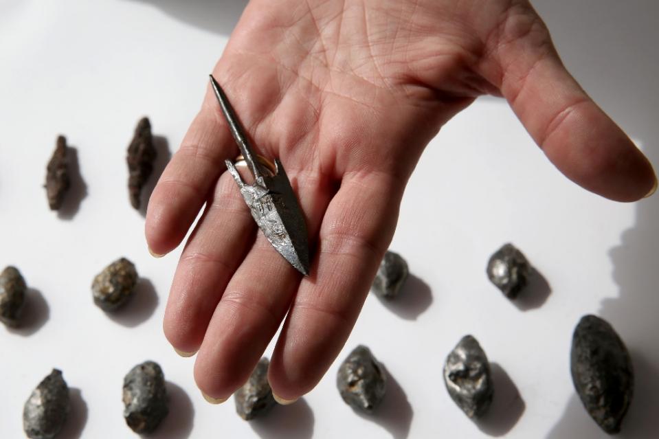 A member of the Israeli Antiquity Authorities displays on November 3, 2015 lead sling stones, bronze arrowheads and ballista stones at a site adjacent to Jerusalem's Old City walls where researchers claim to have found the remains of the Acra (AFP Photo/Gali Tibbon)