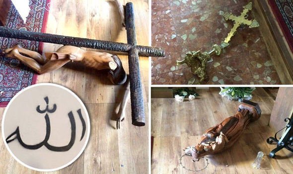 Islamic extremists 'break into church and spray Allah on walls before destroying crucifix'