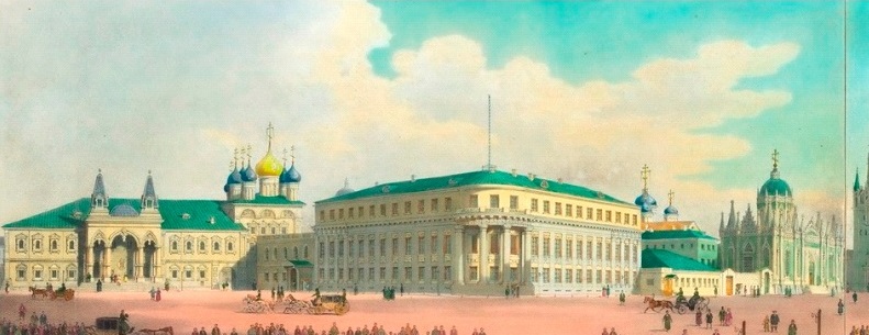 The historic watercolor shows (from left to right): the Chudov Monastery, the Small Nicholas Palace, and the Ascension Convent, which were demolished in 1929, to make way for the Soviet era building which would house the offices of the Presidium of the Supreme Soviet until 2011. The historic watercolor shows (from left to right): the Chudov Monastery, the Small Nicholas Palace, and the Ascension Convent, which were demolished in 1929, to make way for the Soviet era building which would house the offices of the Presidium of the Supreme Soviet until 2011.