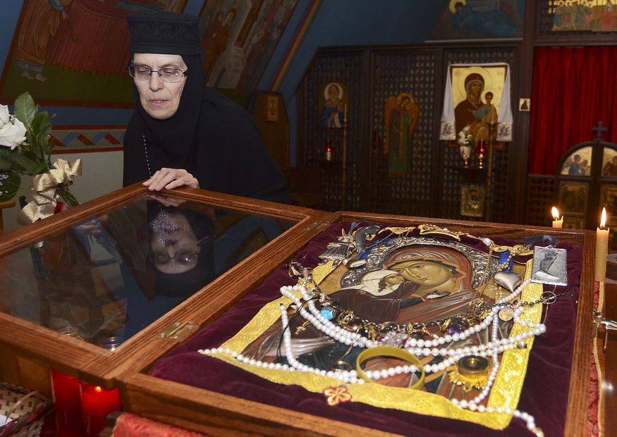 Mother Christophera of the Orthodox Monastery of the Transfiguration in Wayne Township opens a glass case to give a better view of the Icon of St. Anna on Saturday. Mother Christophera of the Orthodox Monastery of the Transfiguration in Wayne Township opens a glass case to give a better view of the Icon of St. Anna on Saturday.