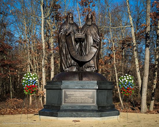 Imprinted in bronze are the figures of Patriarch Alexey II and Metropolitan Laurus, holding in their hands Christ the Savior Cathedral. The monument’s sculptor is Andrey Klykov, and the project’s architects are Gennady and Anatoly Kuznetsov. As the plaque on the plinth bears witness, the monument is "a gift to the Russian Diaspora from the people of Orthodox Russia." Symbolically, a nearly identical monument was installed on the territory of the Nativity of the Mother of God "Kursk Root Hermitage" in the Kursk Diocese. The only difference between the two is that, in the Kursk monument, the two primates are holding the Kursk Root Icon of the Mother of God, while in the American monument, they are holding Christ the Savior Cathedral.