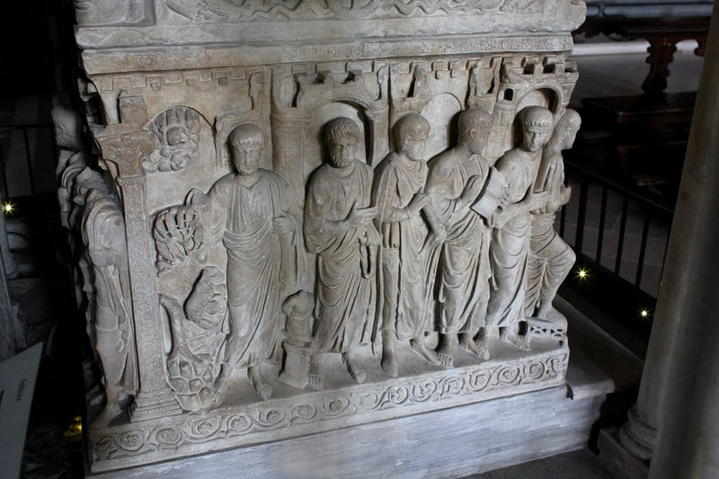 The Sarcophagus of Stililchone is a great treasure—not only is it a magnificent work of Early Christian art, it is one of the few surviving elements from Ambrose's original basilica. It still stands in the exact same place it has been since it was carved in 385 AD—the ambo was built around it. Moreover, it was carved during Ambrose's lifetime and its themes may have been suggested by the bishop himself.