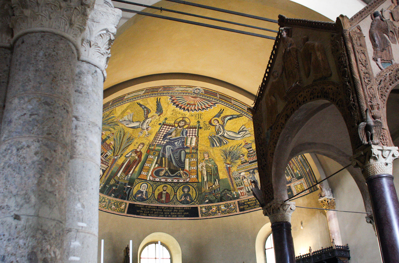 The central scene of the apse mosaic has a late Byzantine layout and probably dates from the early 1200s. The side scenes are probably even earlier - dating from early 9th century in the Carolingian era. These connect St. Ambrose and the city of Milan (Mediolanum) with St. Martin and the city of Tours (Turonica). Both bishops were staunch opponents of the Arian heresy.