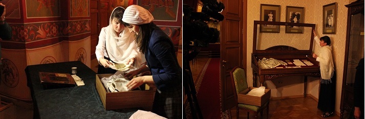 Staff carefully unpack the precious box containing the personal items of Grand Duchess Elizabeth Feodorovna, and place them in a display case at the Museum of the Holy Royal Martyrs in Ekaterinburg. Staff carefully unpack the precious box containing the personal items of Grand Duchess Elizabeth Feodorovna, and place them in a display case at the Museum of the Holy Royal Martyrs in Ekaterinburg.