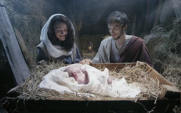 It uses reverse time-lapse techniques to take viewers from a living room where a young couple sit with their newborn baby in front of a roaring fire to the stable in Bethlehem.