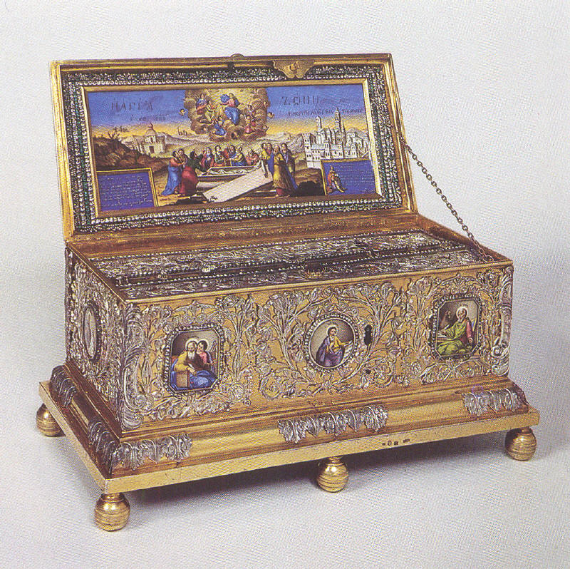 The Girdle of the Blessed Virgin Mary, today divided into three pieces, is the only remaining relic of her earthly life. According to tradition, the girdle was made out of camel hair by the Virgin Mary herself, and after her Dormition, at her Assumption, she gave it to the Apostle Thomas. During the early centuries of the Christian era it was kept at Jerusalem and in the fourth century we hear of it at Zela in Cappadocia. In the same century, Theodosius the Great brought it back to Jerusalem, and from there his son Arcadius took it to Constantinople. There it was originally deposited in the Chalcoprateion church, whence it was transferred by the Emperor Leo to the Vlachernae church (458). During the reign of Leo VI ‘the Wise’ (886-912), it was taken to the Palace, where it cured his sick wife, the Empress Zoe. She, as an act of thanksgiving to the Mother of God, embroidered the whole girdle with gold thread, giving it the appearance which it bears today.