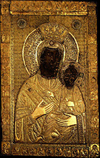 In the tenth century, during the course of a raid on the monastery by the Arabs, the hierodeacon Sabbas, who was sacristan at the time, managed to hide the icon in the well of the sanctuary, together with the cross of Constantine, placing a lighted candle in front of them. The Arabs plundered the monastery and the deacon Sabbas was carried off as a prisoner to Crete. He gained his liberty seventy years later and returned to the monastery. The younger monks, who knew nothing of the hidden treasures, opened the well on his instructions and found the icon and the cross standing upright on the water and the candle still burning.