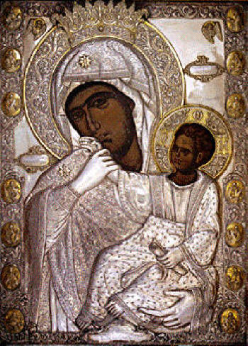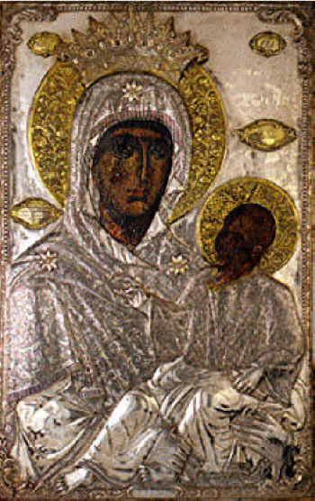 This miracle-working icon dates from the seventeenth century and hangs on the left hand shrine of the eastern column of the katholikon. According to the accounts of the elders of the monastery, the first indication that this icon bestowed especial grace was the following event: one day a young man entered the church and went to reverence the icon. Suddenly the face of the Blessed Virgin shone and some unseen force hurled the young man to the ground. When he came to, he confessed with tears to the fathers that he had been living far from God and that he had been involved with magic. The miraculous intervention of the Virgin resulted in the young man changing his way of life and becoming devout.