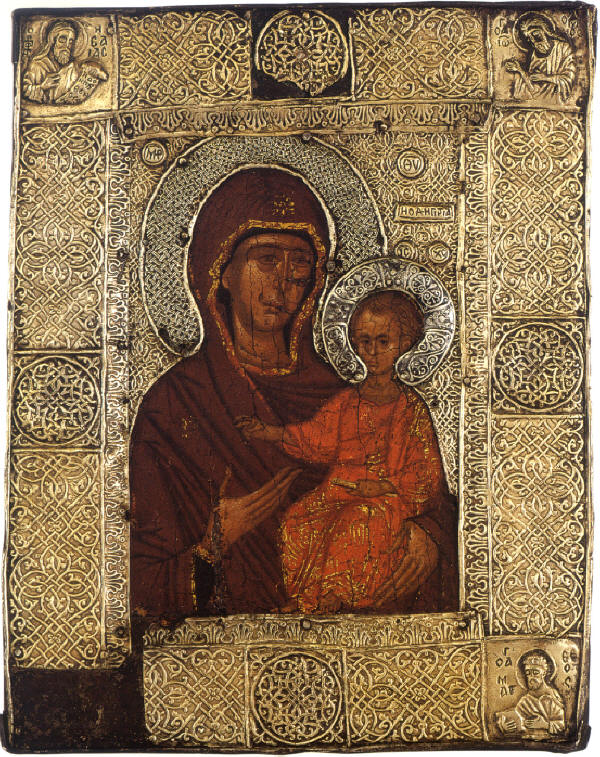 The icon of the Eleousa is kept in the same chapel, above the shrine on the left. It dates from the fifteenth century and comes from the Russian skete of St. Andrew, from which it was recently brought to the monastery. According to information given by Gerasimos Smyrnakis, the icon was at one time built into the wall of a mosque in Constantinople which had formerly been a Christian church. It was discovered by some Christian workmen who were repairing the mosque in 1893 and secretly sold to Sofronios, the steward of the skete’s metochiin Galata. From there it was brought by Russian monks to Mount Athos and placed in the kyriakon of the skete of St. Andrew.