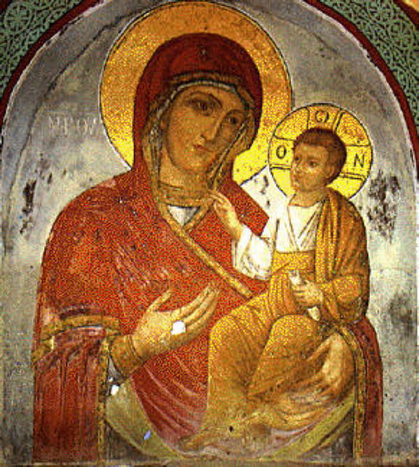 Three doors open on to the narthex. The central door is clad with bronze plates on which are embossed plant and other decoration, as well as a depiction of the Annunciation in relief. According to tradition, this door came from the Church of the Holy Wisdom in Thessaloniki and was brought to the monastery after the city was taken by the Turks (1430). The other two doors lead to the chapels of St. Nicholas and St. Demetrius, respectively, on the right and left of the lite. Over the door of the chapel of St. Nicholas is a depiction of the saint in mosaic (14th century), in a rather poor state of preservation. On the right is a large fresco of the Blessed Virgin holding the Holy Child. This fresco replaced the miracle-working icon of the Paramythia, which after the miracle was removed to the chapel of the same name.
