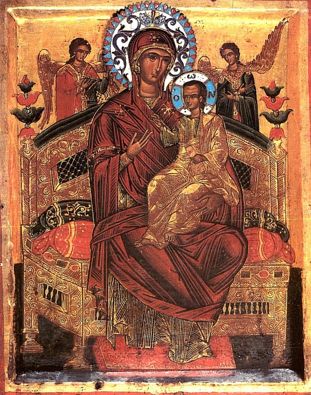 The carved wooden iconostasis, of oak, dating from 1788, replaced an older one of marble, a part of which remains in its original position. The large icons on the screen, work of the Palaeologue era, were gilded by Count Dmitri Nikolayievitch Seremetiev in 1857. In front of the two eastern columns are shrines with fine Byzantine icons of Our Lady Hodegetria and the Hospitality of Abraham. According to tradition, these icons came from the Church of Holy Wisdom in Thessaloniki. Above the abbatial throne on the left (1619) is an icon of the 14th century depicting Sts Peter and Paul, a gift of the Despot Andronicus Palaeologue (1421).